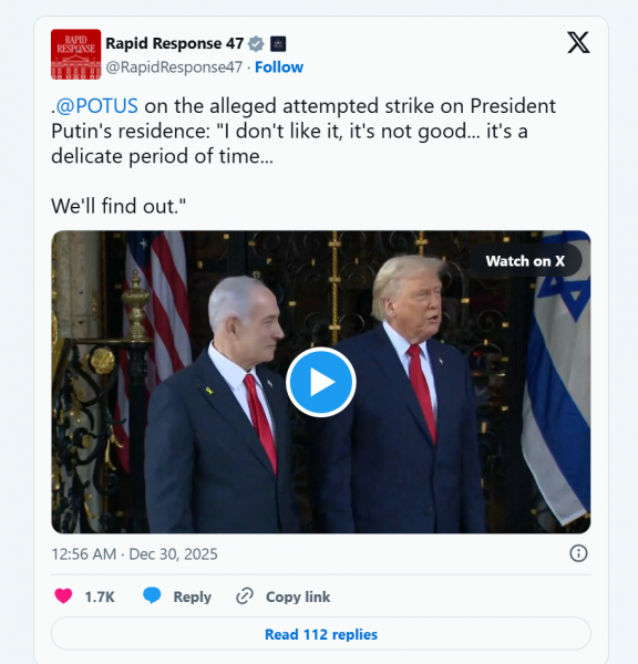 «Мне это не нравится. Это плохо. Я узнал об этом сегодня утром. Президент Путин рассказал мне об этом. Рано утром он сказал, что на него напали. Это плохо. Это плохо. Не забывайте, я остановил поставки «Томагавк» [Украине], я не хотел этого», — заявил Трамп.